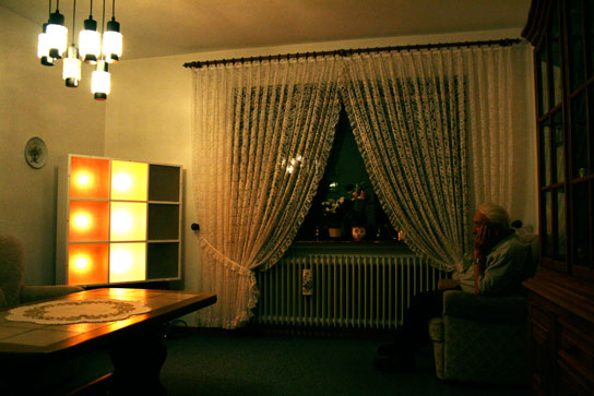 In ihrer Struktur bewegt sich die Installation zwischen Stimmungslampe und Elektro-Grafik. In jedem der neun Felder ist eine RGB-LED installiert, mit der sich theoretisch jede Lichtfarbe darstellen läßt. Fünf Regler zum Steuern der Farben und Abläufe machen sie dann auch noch zum Spielzeug, zum abstrakten Fernseher mit neun Pixeln.